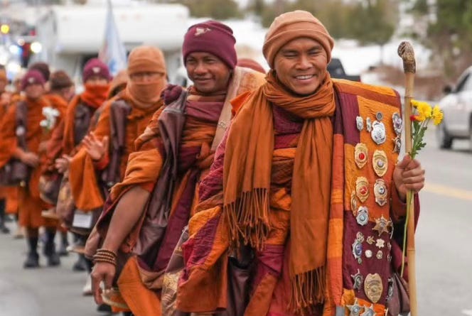 Accompanied by their dog, Aloka, a group of 19 monks from the Theravada Buddhist tradition walked about 2,300 miles (3,700 kilometres) in 108 days to promote peace, compassion, mindfulness and nonviolence. Along the way they attracted millions of followers on social media—including so many of us.